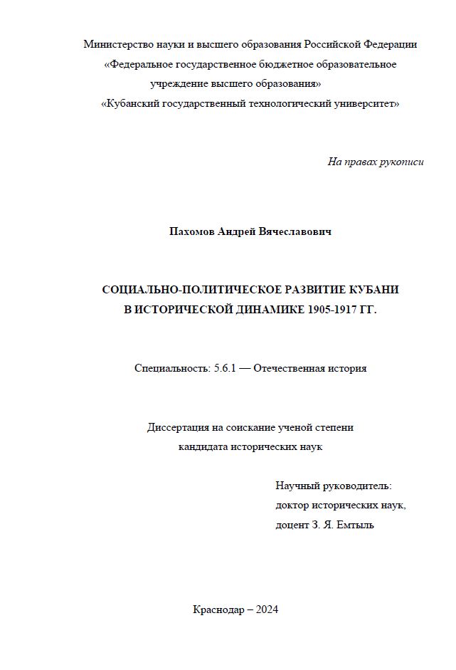 диссертация, социально-политическое развитие Кубани, историческая динамика 1905-1917 гг