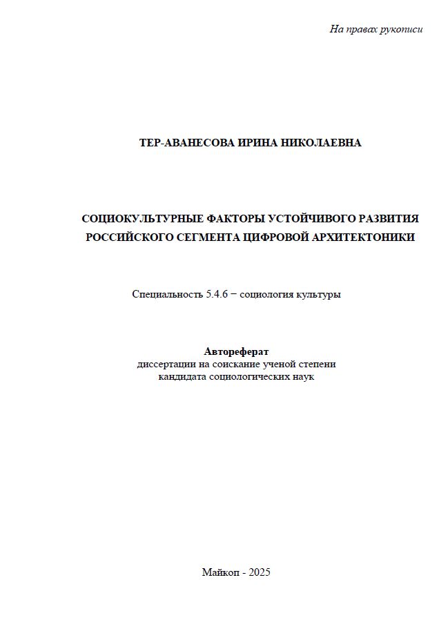 автореферат, теоретические подходы к исследованию цифровой архитектоники, анализ факторов, социокультурные особенности российского сегмента, социокультурный профиль российского сегмента цифровой архитектоники